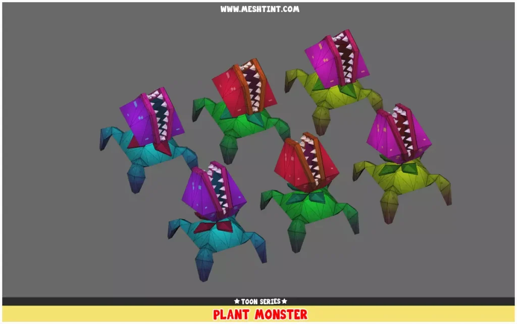 Triangle count is only 336! Textures are hand painted and available in 3 colors. They are rigged and animated. There are 13 animations Generic Mecanim rig set up. Soundwave FX Unity particles is included in this package.